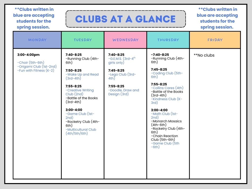 Do you love to sing? Then join the Collins Choir and sing on Mondays after school from 3-4pm! In Choir, students will learn several pieces of music to perform at our annual Astronaut Choir Concert in April. This club is for 5th and 6th grade students only. This club is led by Mrs. Carvell, Ms. Speedy, and Mrs. Fitzgerald.